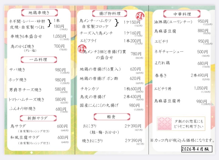 当店自慢の鳥メンチや鳥サラダ、焼鳥など取り揃えております。